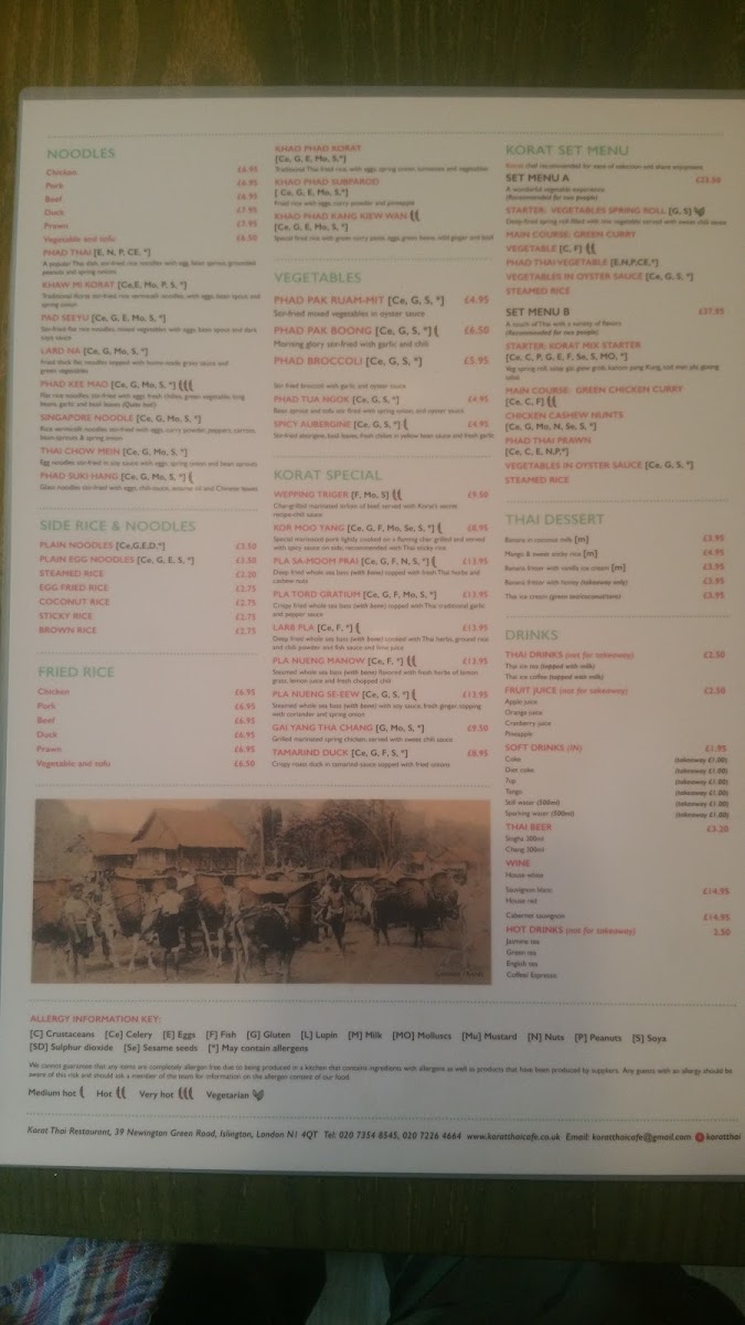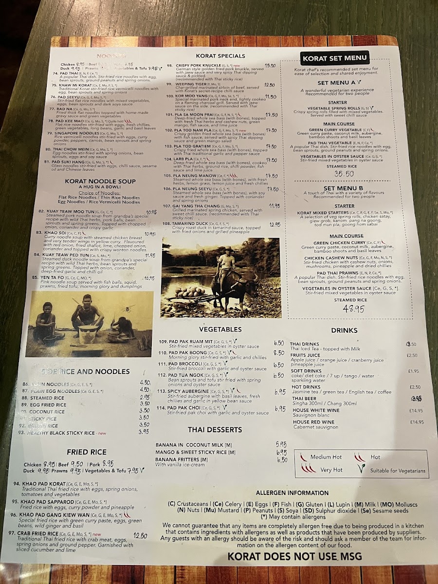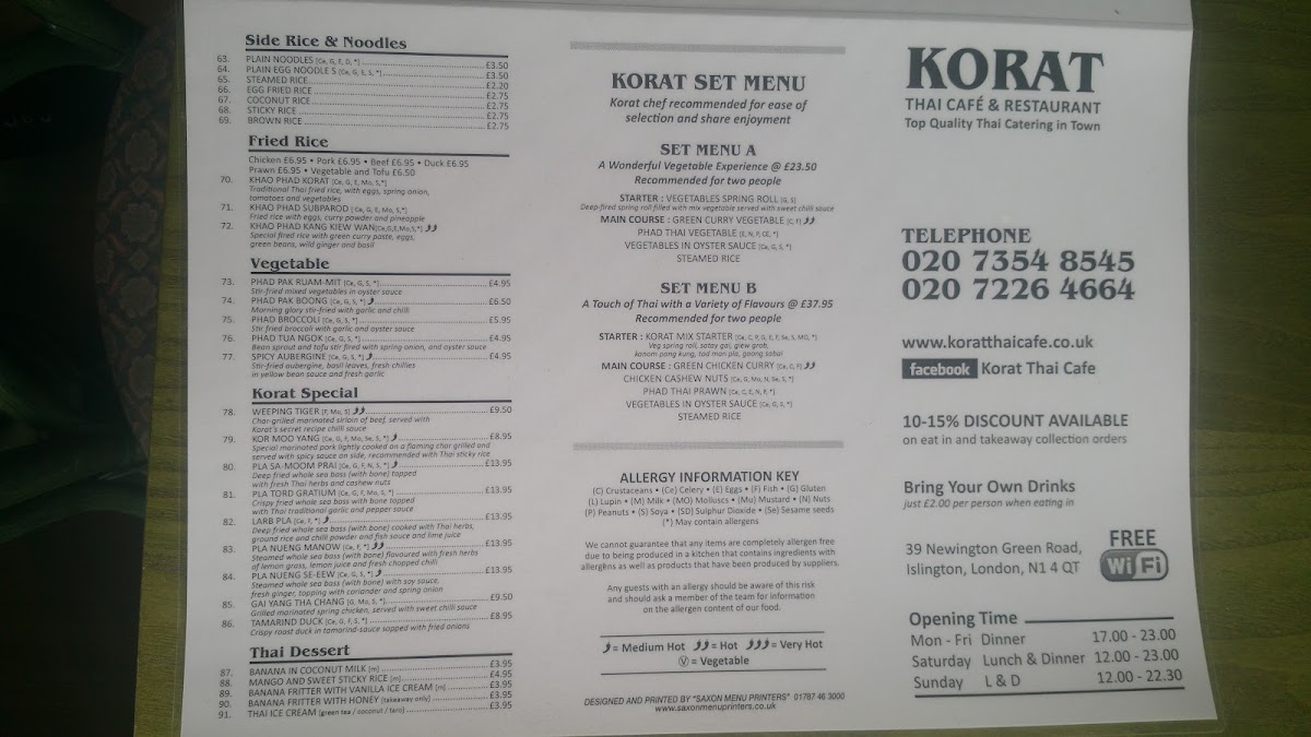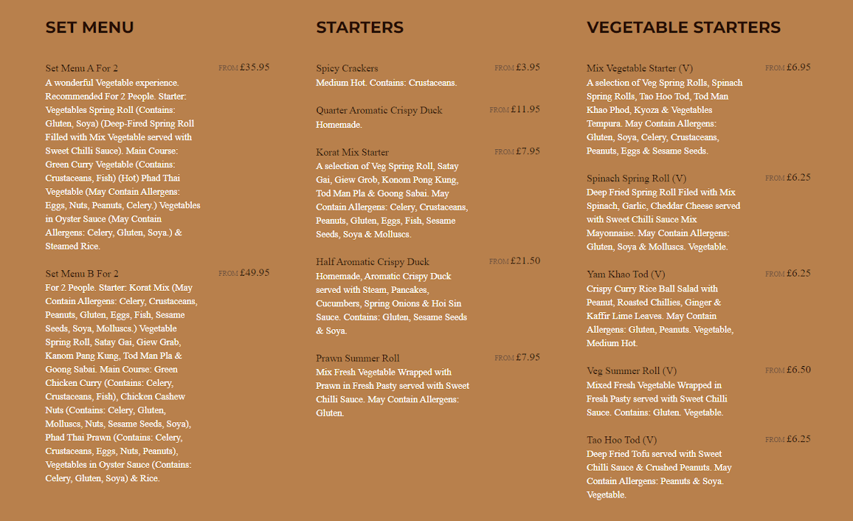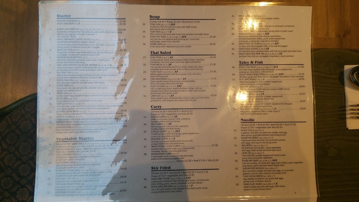 Korat Thai Cafe offers an extensive and vibrant menu, showcasing the rich flavors of Thai cuisine. The set menus, Set Menu A for 2 and Set Menu B for 2, are perfect for those looking to experience a variety of dishes. For starters, options like Spicy Crackers and Quarter Aromatic Crispy Duck stand out, with prices available upon request. The menu also features vegetable-based starters such as Spinach Spring Roll (V) and Veg Summer Roll (V), catering to different dietary preferences. Soups like the Tom Yum Soup (Spicy) and the comforting Tom Kha Soup provide a perfect beginning to the meal. Noodle soups, such as Khao Soi and Kuay Teaw Moo Tun, offer hearty and flavorful options. The Thai salads are bold, with dishes like the Somtom Salad (Spicy) and Yum Neua (Spicy). When it comes to curry, the Green Curry (Spicy) and Red Curry Traditional Duck Curry are notable highlights. Stir-fried dishes, including Phad Kra Prow (Spicy) and Phad Nam Mon Hoi, offer a satisfying balance of heat and flavor. For those craving seafood, options like Phad Cha Taley (Spicy) and Pla Lard Pring (Spicy) are delicious choices. The restaurant also serves several noodle dishes, such as Phad Thai and Khaw Mi Korat, alongside a variety of rice options like Sticky Rice and Coconut Rice. The Crab Fried Rice and Khao Phad Subparod are great picks for those who want to try a unique twist on fried rice. Vegetarians can enjoy Phad Pak Ruam-Mit (V) or Phad Tua Ngok. Special dishes like Weeping Tiger and Korat Moo Yang are ideal for those looking for a memorable main course. To conclude the meal, indulge in Thai desserts like Mango & Sweet Sticky Rice or Banana Fritter with Vanilla Ice Cream. With a variety of beverages, including Coca-Cola Original and Sparkling Water, the menu at Korat Thai Cafe promises a delightful and authentic Thai dining experience.