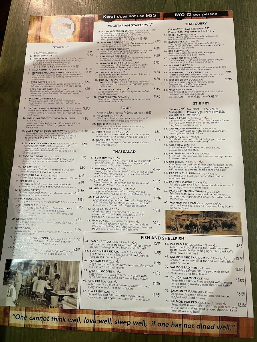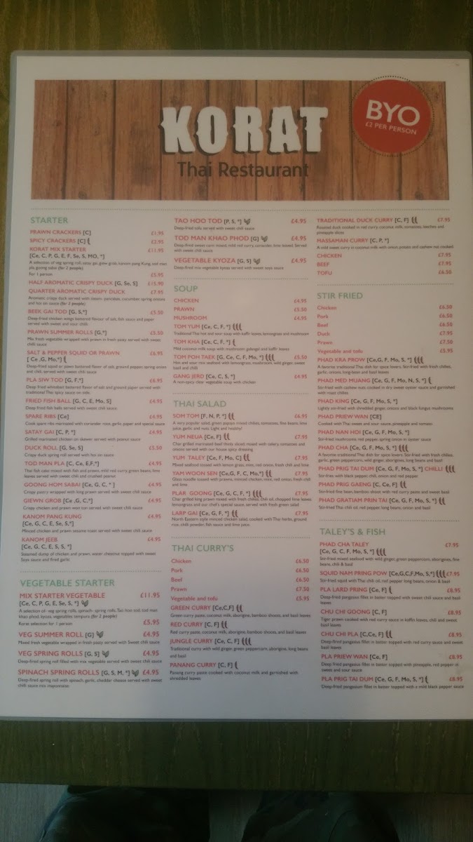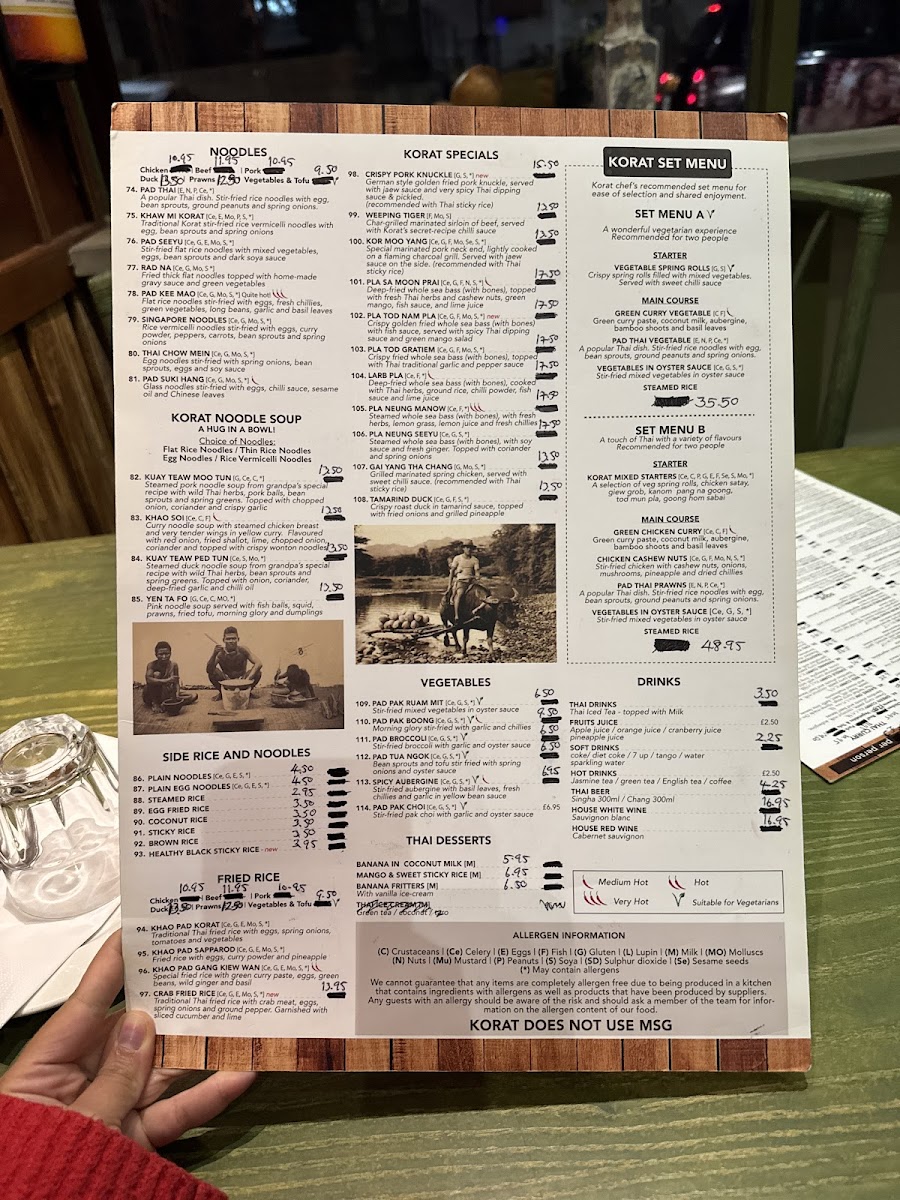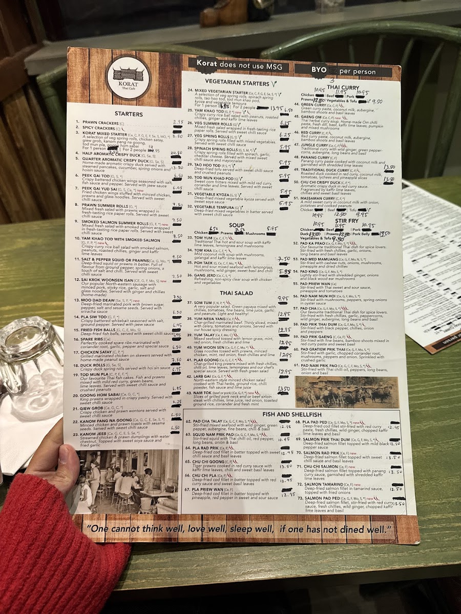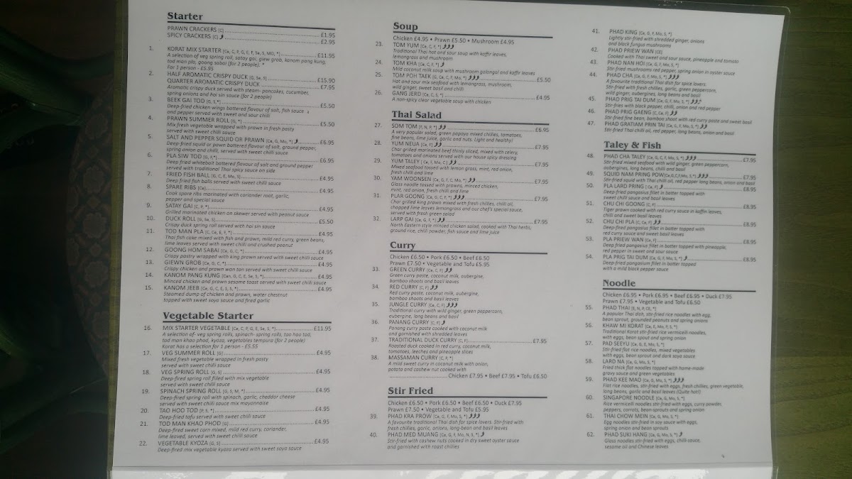 Korat Thai Cafe offers an extensive and vibrant menu, showcasing the rich flavors of Thai cuisine. The set menus, Set Menu A for 2 and Set Menu B for 2, are perfect for those looking to experience a variety of dishes. For starters, options like Spicy Crackers and Quarter Aromatic Crispy Duck stand out, with prices available upon request. The menu also features vegetable-based starters such as Spinach Spring Roll (V) and Veg Summer Roll (V), catering to different dietary preferences. Soups like the Tom Yum Soup (Spicy) and the comforting Tom Kha Soup provide a perfect beginning to the meal. Noodle soups, such as Khao Soi and Kuay Teaw Moo Tun, offer hearty and flavorful options. The Thai salads are bold, with dishes like the Somtom Salad (Spicy) and Yum Neua (Spicy). When it comes to curry, the Green Curry (Spicy) and Red Curry Traditional Duck Curry are notable highlights. Stir-fried dishes, including Phad Kra Prow (Spicy) and Phad Nam Mon Hoi, offer a satisfying balance of heat and flavor. For those craving seafood, options like Phad Cha Taley (Spicy) and Pla Lard Pring (Spicy) are delicious choices. The restaurant also serves several noodle dishes, such as Phad Thai and Khaw Mi Korat, alongside a variety of rice options like Sticky Rice and Coconut Rice. The Crab Fried Rice and Khao Phad Subparod are great picks for those who want to try a unique twist on fried rice. Vegetarians can enjoy Phad Pak Ruam-Mit (V) or Phad Tua Ngok. Special dishes like Weeping Tiger and Korat Moo Yang are ideal for those looking for a memorable main course. To conclude the meal, indulge in Thai desserts like Mango & Sweet Sticky Rice or Banana Fritter with Vanilla Ice Cream. With a variety of beverages, including Coca-Cola Original and Sparkling Water, the menu at Korat Thai Cafe promises a delightful and authentic Thai dining experience.